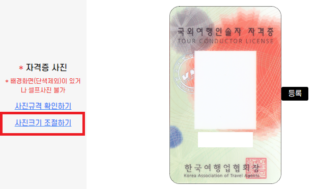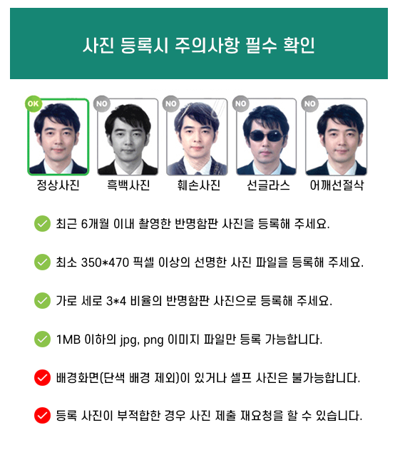 규격에 맞지 않은 사진을 등록할 경우 자격증 발급신청은 반려됩니다.